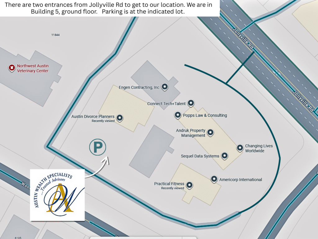 Or office has moved over the years and some older directional GPS devices may remain with an old address. We are located at – 11824 Jollyville Rd Suite 500, Austin, TX 78759 Here is an overview of how to find us when in our office community block. When entering off of Jollyville Road, follow around to the back. We are in building 5, It is the bottom floor, Suite 500. There is plenty of parking right outside of our office.